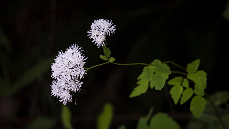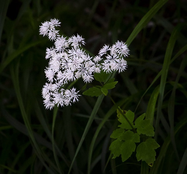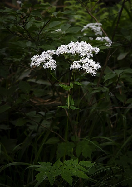 숲속에서 자란다. 높이 약 50cm이다. 뿌리줄기가 짧고 양 끝이 뾰족한 원기둥 모양으로 굵어진 뿌리가 사방으로 퍼진다. 줄기는 곧게 선다. 뿌리에 달린 잎은 1개이고 잎자루가 길며 3개씩 2∼3회 갈라진다.