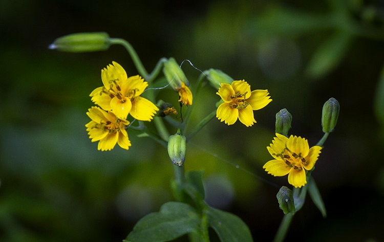 9∼10월에 가지와 줄기 끝에 지름 10mm 정도의 노란 꽃이 산방꽃차례로 핀다. 총포는 5조각으로 줄 모양이며 길이 약 5.5mm, 나비 약 7mm이다. 작은꽃은 5개이고 화관은 길이 6∼7.5mm, 나비 2∼2.5mm이다.