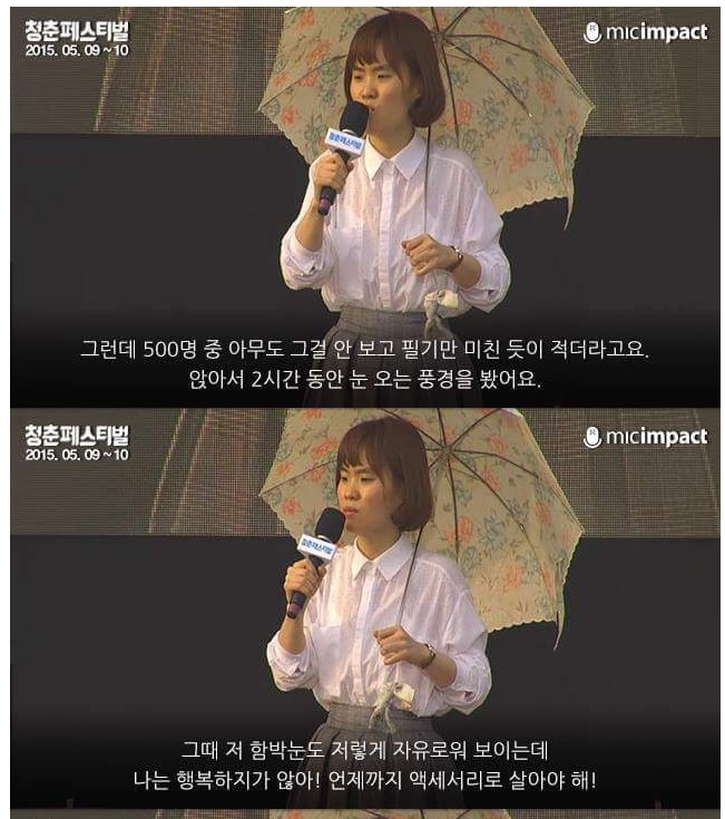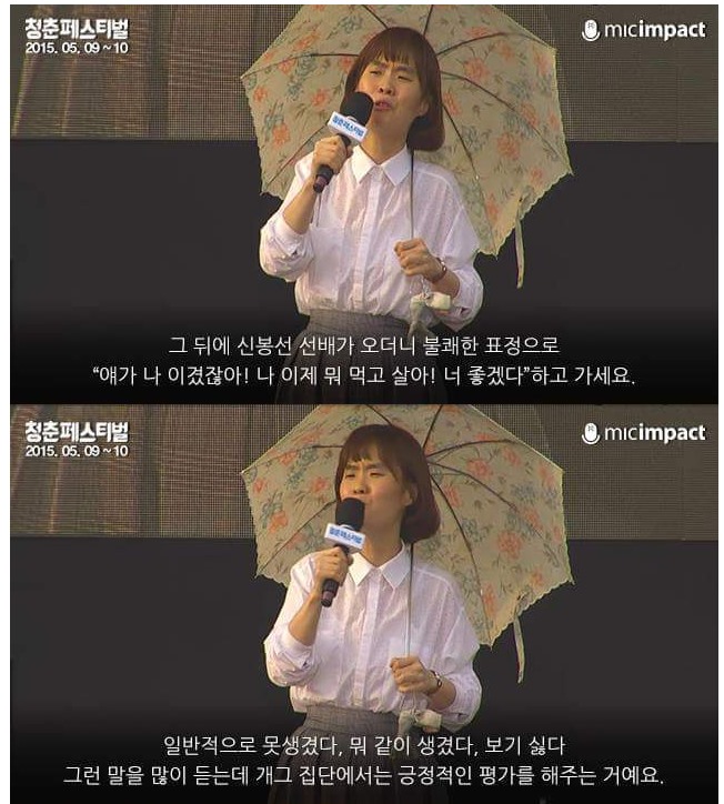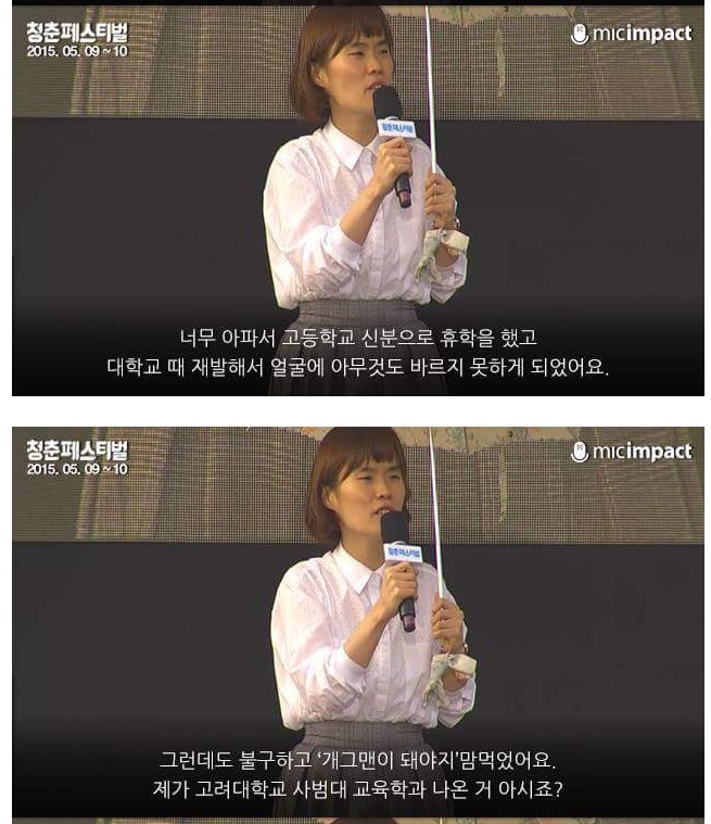 피부질환으로 TV에 출연하는 사람이면 누구나 할 수 있는 분장조차 할 수 없었던 개그우먼 박지선. 조명(照明)이 내리쬐는 곳에서는 서있는 것조차 힘들었다는 그녀는 외모(外貌) 지상주의(至上主義)를 추구하는 한국사회에서 자신의 얼굴을 빗댄 다음과 같은 말로 대중(大衆)을 격려하며 감동을 주기도 했다.