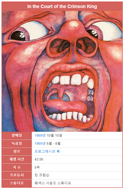 Epitaph, 1969년 발매된 영국의 프로그레시브 록밴드 King Crimson의 데뷔 앨범이자 세계 최초의 프로그레시브 록 앨범이다. 영국 앨범 차트에서 5위를, 미국 빌보드 200 앨범 차트에서 28위를 기록했다. King Crimson은 1969년 4월 9일에 라이브 데뷔를 했고, 그해 7월 런던의 하이드 파크에서 열려 약 25만 ~ 50만 명의 사람들이 몰린 것으로 추정되는 롤링 스톤즈의 자선 콘서트에서 오프닝 밴드로서 공연해 어느정도 돌파구를 마련했다.