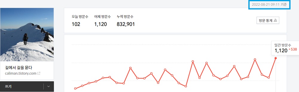아래 이미지는 8월 20일 '똥구멍으로 호박씨 깐다'를 게시하고 8월 21일 오전 9시 11분에 캡쳐한 것이다. 8월 20일 방문객은 1,120명, 그리고 방문객이 새로이 집계되는 오전 8시부터 9시 11분까지 1시간 11분 사이에 102명이 블로그를 방문했다.
