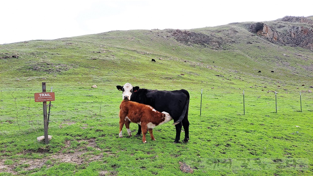 송아지가 엄마 젖을 머리로 들이받으면서 열심히 빨고 있다. ↑