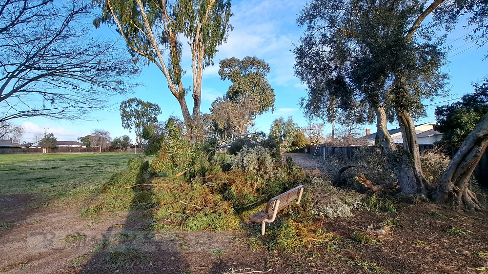 간 밤의 세찬 바람에 부러진 나뭇가지가 길을 막고 있다 ↑ ↓