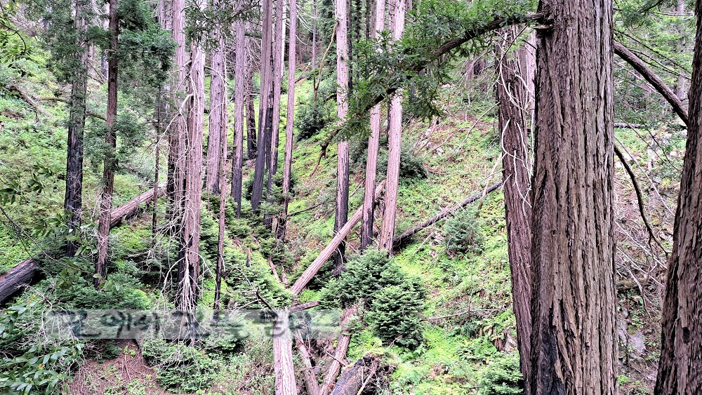 불이 났었는지 밑동이 새카맣게 그을린 Redwood 숲 ↓