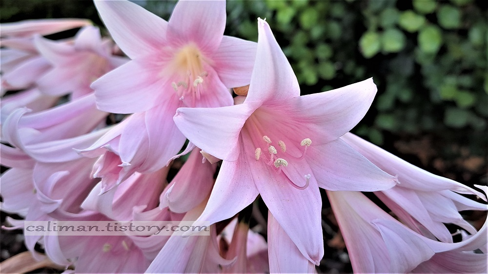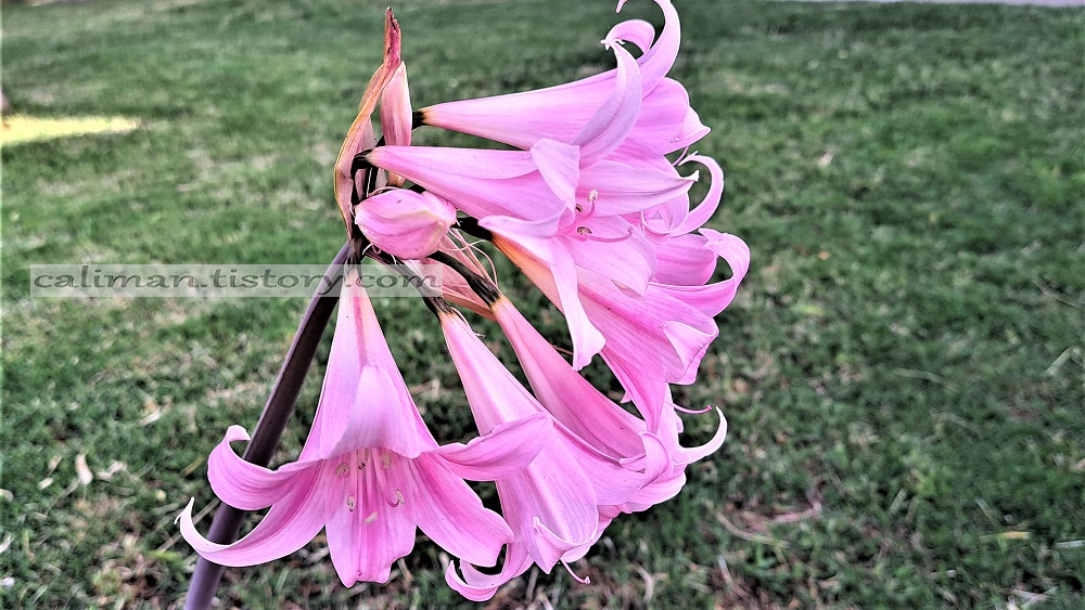 7월 말부터 아침 산책길에 볼 수 있는 꽃이다. 잎은 없고 줄기 한 개에 4~10개씩 달려있는 꽃이 궁금해 구글검색을 해보니 'Jersey lily'라는 이름을 가진 꽃이다. 남아프리카 케이프(Cape Province in South Africa) 지방이 원산지로 수선화과 여러해살이 식물이다. 통상 'Amaryllis belladonna'라고 하지만 Belladonna-lily, Naked-lady-lily, March lily라고 부르기도 한다.