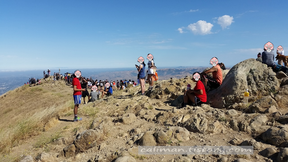 ↑ 빨간 상의를 입은 흑인 청년이 검은 옷을 입은 백인과 나에게 Pole이 잘려나갔던 상황을 설명한다. 사진을 찍기 위해 길게 줄을 서는 하이커들이 보기 싫었던 어떤 '몽니쟁이'가 Pole의 중간을 잘라서 아래↓낭떠러지로 굴려놓은 것을 찾아서 복구한 것이라고 한다.
