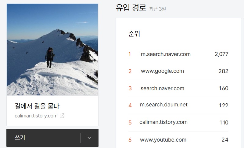 Daum 블로그를 폐쇄한다는 카카오 방침에 따라 다음블로그를 티스토리로 이전한 후 Google Search Console, NAVER Search Advisor, Daum 검색, Microsoft Bing Webmaster Tools, 줌(zum)에 등록했다. 이후부터 검색에 노출되는지 방문객이 증가하면서 지금은 포스팅을 한 날은 천여 명, 그렇지 않은 날은 600~800명가량이 블로그를 방문하고 있다.