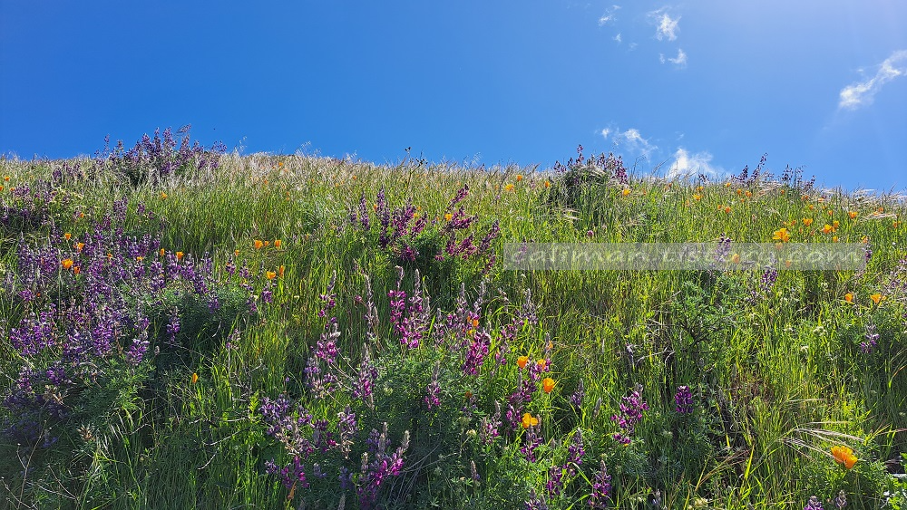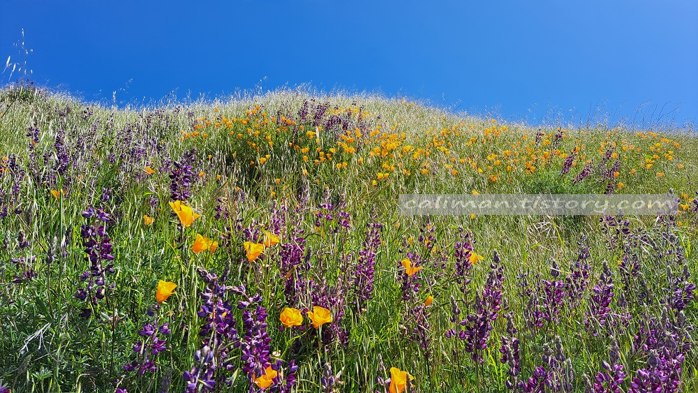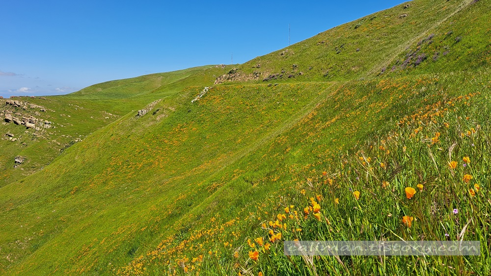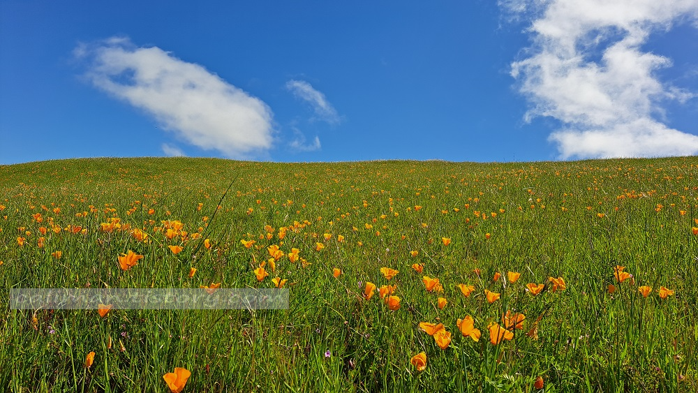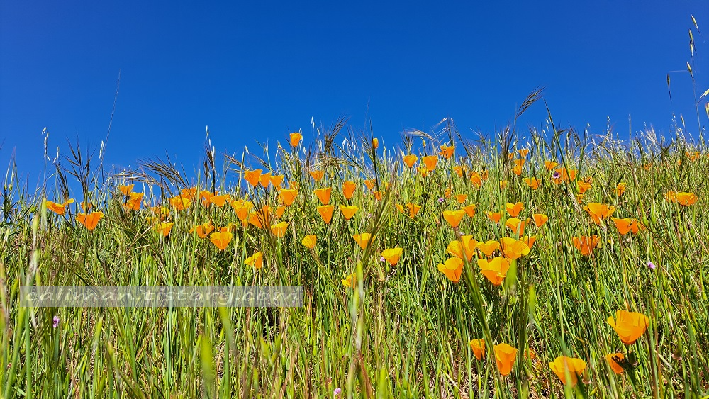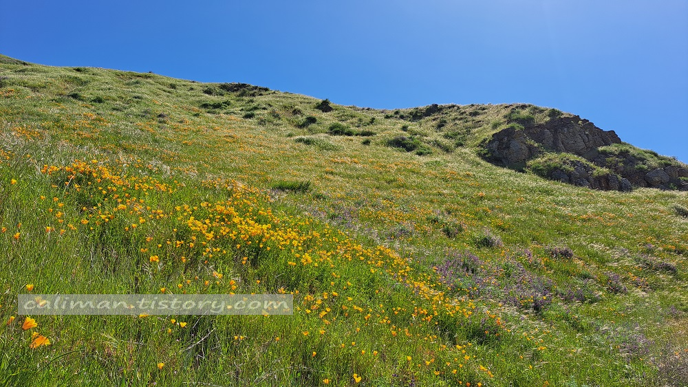 파란 하늘과 어우러진 초록의 능선에는 California Poppy(금영화)가 만개해 세파(世波)에 찌든 두 눈을 호강시켜 준다 ↑ ↓