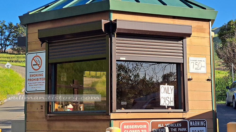 일몰시간 오후 7시 50분, 오로지 현찰($6)만 받는다는 안내문이 붙어있는 Ed R. Levin County Park Entrance Booth ↑ 공원은 오전 8시에 개방(開放)해서 일몰(日沒) 시간에 닫는다.