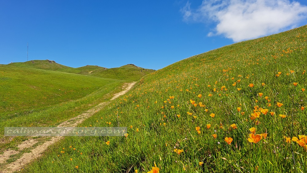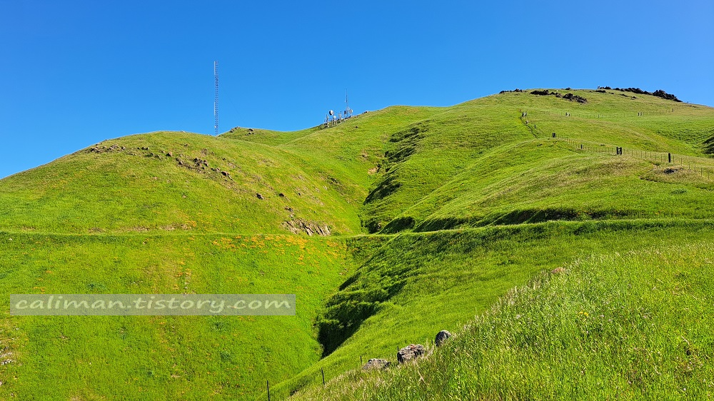 나는 만개한 California Poppy(금영화)을 감상하기 위해 소방도로인 Monument Peak Road를 걸어 주차장으로 간다 ↓