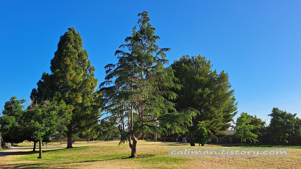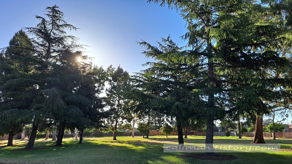 넓은 잔디와 나무사이를 체리가 걸어가는 것 같다.