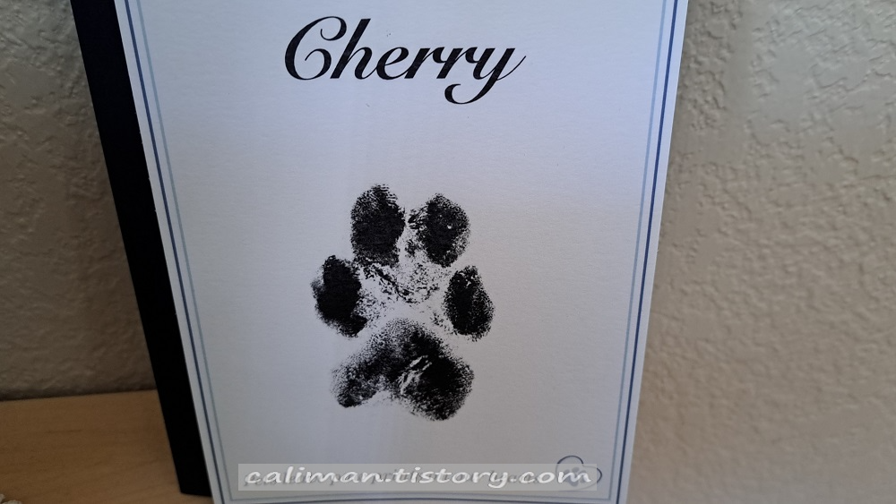 우리에게 행복을 줬던 체리에게 고맙다는 인사말을 적었다. 흰 종이는 빼내고 체리 사진을 넣을 것이다.