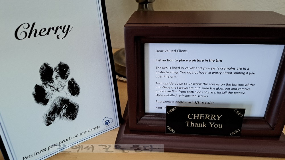 지난 6월 16일 오후 6시 4분 무지개다리를 건넌 체리의 화장(火葬)을 의뢰했던 장례식장에서(↑) 화장이 완료되었다는 연락을 받고 6월 28일(금) 오전, 체리를 집으로 데려왔다. 덩치가 컸던 녀석이 한 줌 재로 변해 작은 상자에 담겨져 있는 것이 슬펐지만 사람이나 짐승이나 나이가 들어 시들어지면 가야만 하는 것을..ㅠ