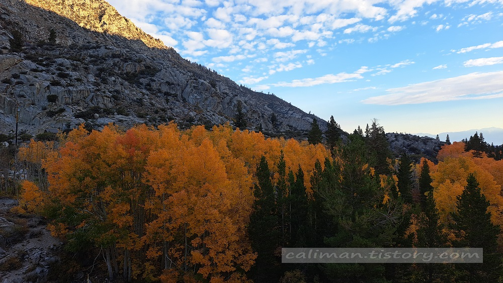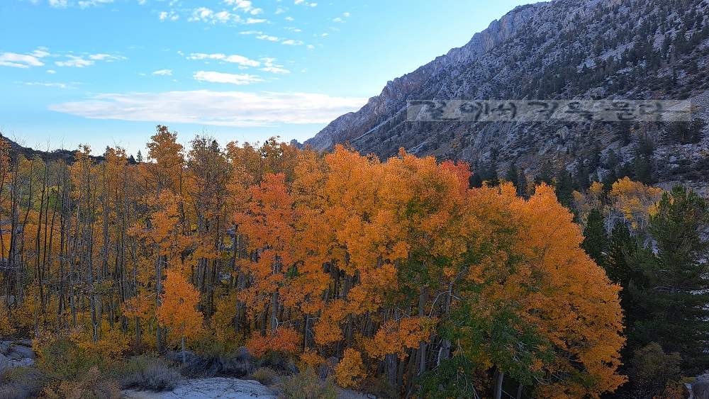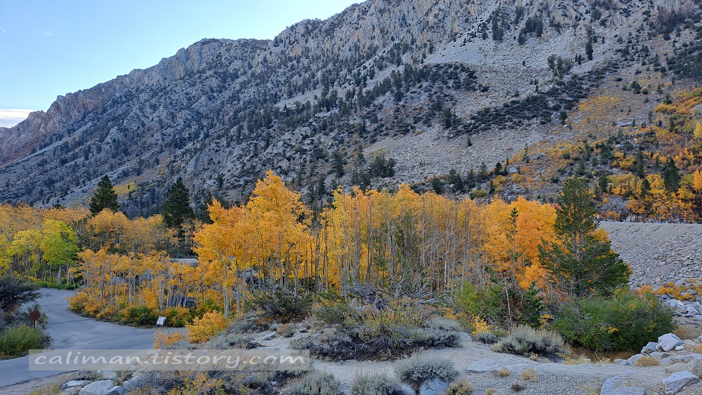'노랗다'보다는 '샛노랗다'라는 표현이 맞을 것 같다. 10월 초, 중순, Bishop에서 Lake Sabrina으로 가는 길은 황금빛 Aspen 단풍이 절정을 이뤄 보는 이의 가슴을 설레게 한다. 기후 변화에 따라 매년 단풍이 물드는 시기는 약간의 차이가 있지만 고도 9,128 feet(2,782 m)에 위치한 Sabrina Lake은 10월 초, Bishop 주변은 10월 20일 이후면 아름다운 단풍을 볼 수 있다.