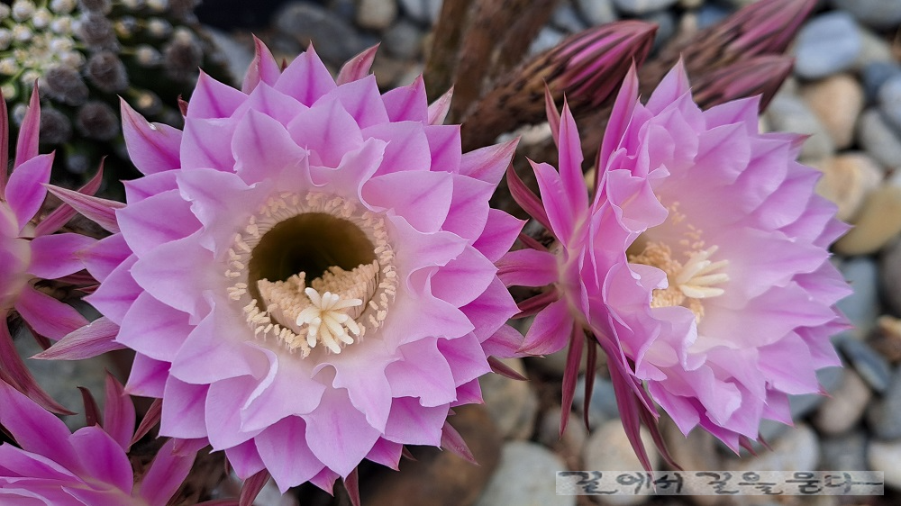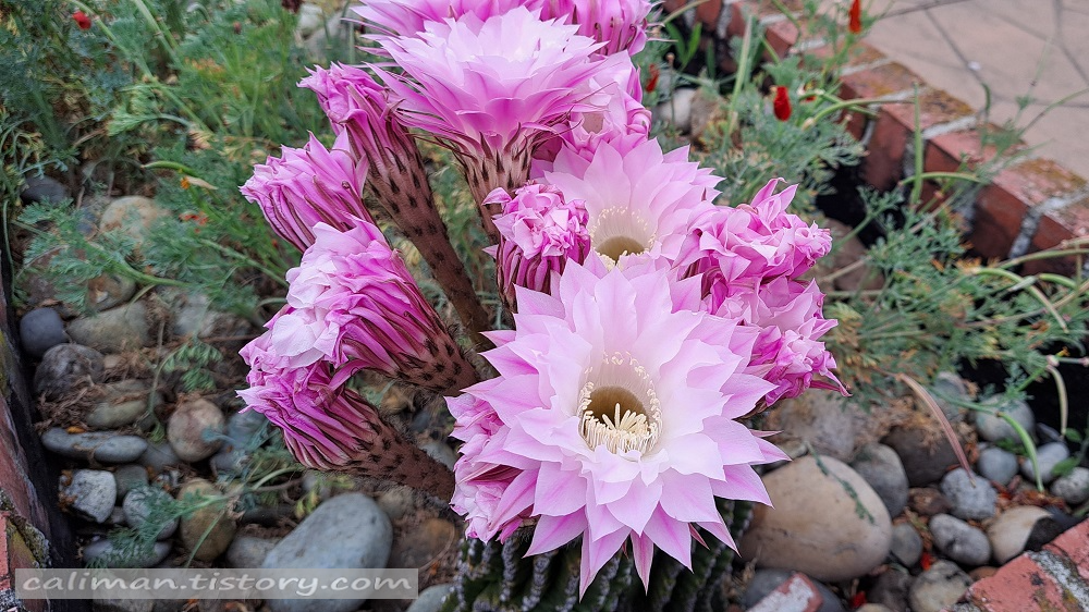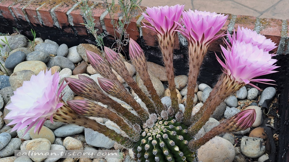 아침 산책길에 피어있는 선인장 꽃, 어제는 안 보였던 꽃이 오늘 아침 아름다운 자태를 보여준다. 이렇게 화려한 모습을 보여주고 이틀 후면 꽃을 떨구며 시든다. 궁금해서 구글 검색을 해보니 이스터 릴리 선인장(Easter Lily Cactus)으로 나온다. 학명은 Echinopsis oxygona, 통상 Easter Lily Cactus(이스터 릴리 선인장)이라고 부른다.