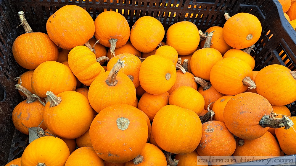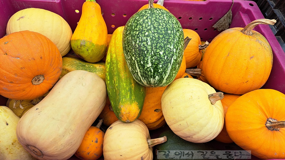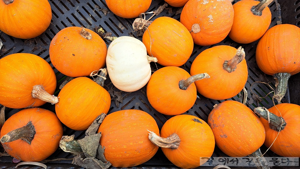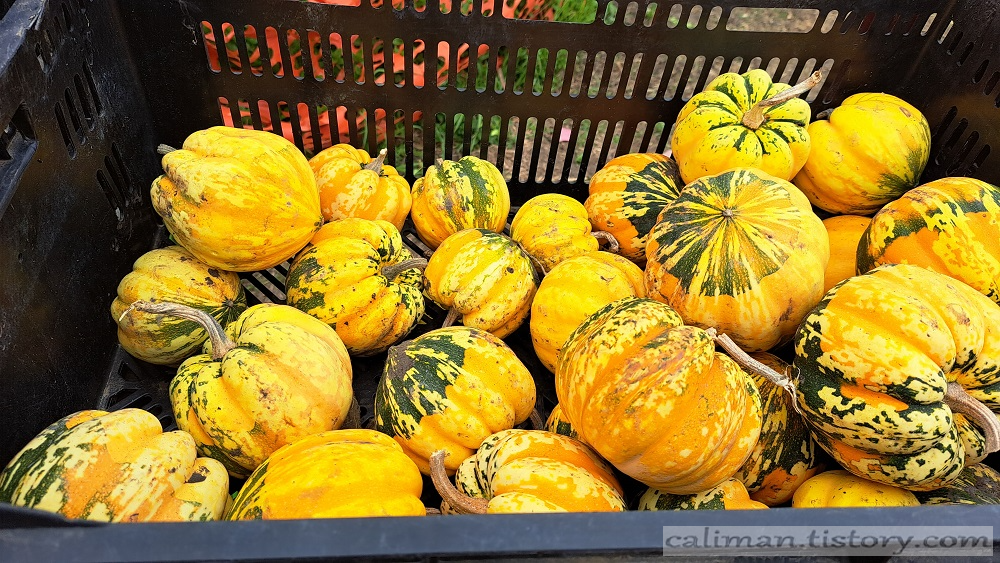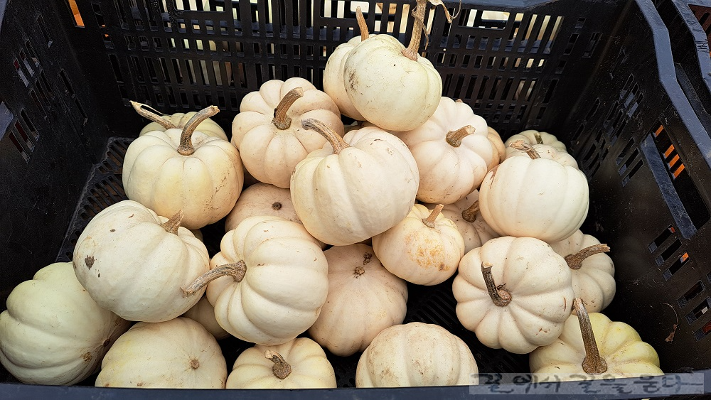 넓은 밭에 호박이 널려있다. ↑ ↓ 작고 앙증맞은 호박들이 바구니에 담겨 손님을 기다리고 있다. ↑ ↓
