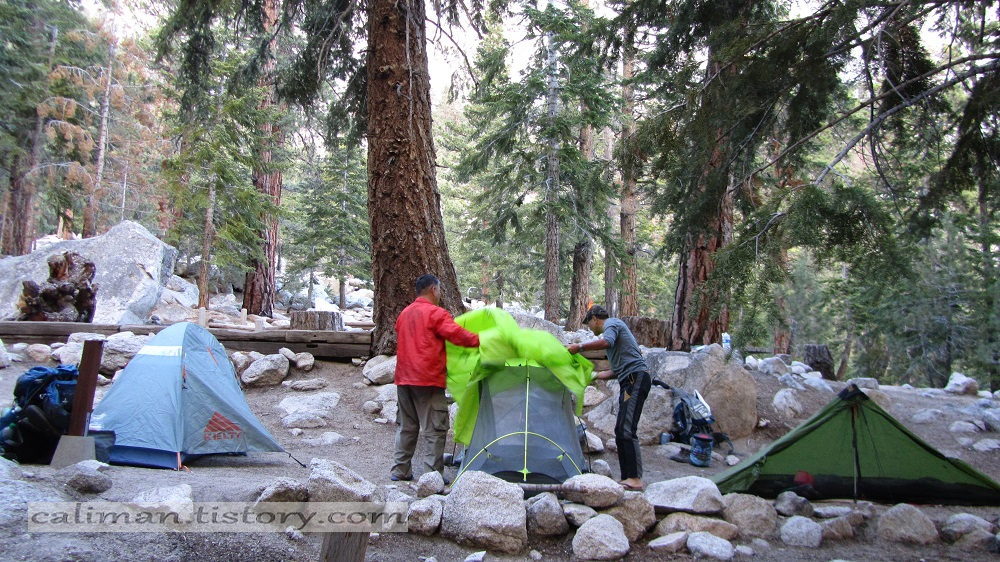 ↑ Moffat Ranch Road를 따라서 Mt. Whitney Trailhead에 있는 Hiker's Campground로 간다 ↓ 7월 18일 오후 6시쯤 도착한 Whitney Portal의 Hiker's Campground에서 텐트를 설치하고 있는 이사장과 권박사. 겨우 텐트 한개를 설치할 수 있는 작은 공간은 One night $13이다. 늦은 밤에 도착해서 밤을 지낸 후 이른 아침 떠나면 공짜 야영을 할 수도 있다.